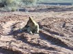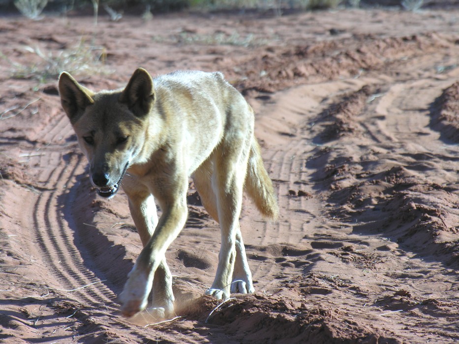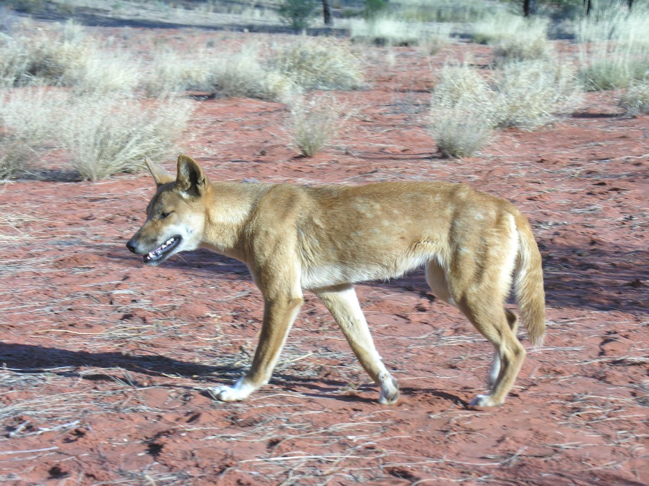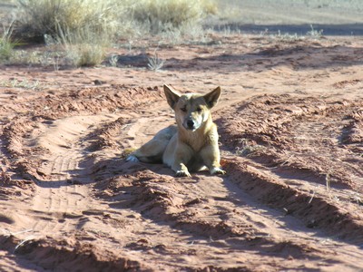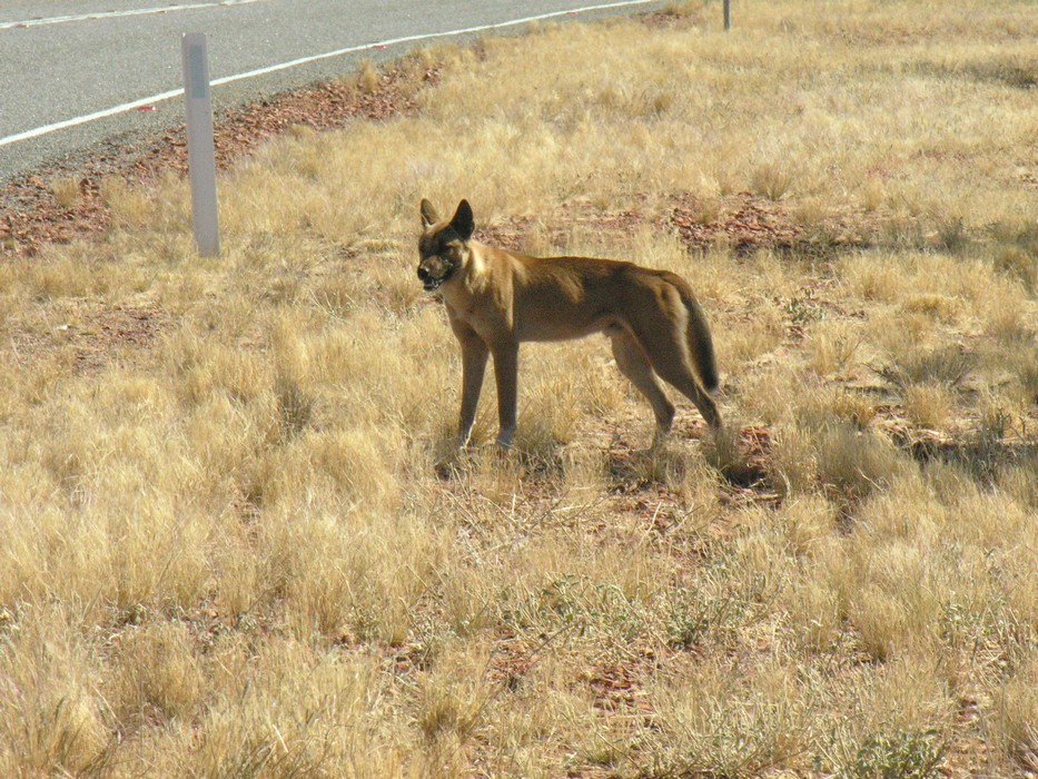 Im allgemeinen lassen sich die meist sehr scheuen Dingos kaum fotografieren, dieser aber machte eine Ausnahme und setzte sich keine 10 m von unserem parkierten Auto entfernt auf den Boden. Vermutlich spekulierte er auf einen Happen, den er auch in Form eines Salamistückes nach dem Fotoshooting von uns bekam.