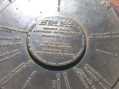 Oben auf dem Ayers Rock befindet sich ein Kompass auf dem man das Seelevel von 865 m ablesen kann, sowie die umliegendem Felserhebungen vom Uluru-Kata Tjuta Nationalpark.