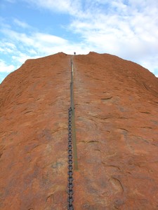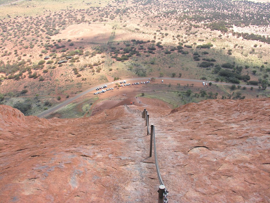 Der Auf- bzw. Abstiegsweg der kantigen Oberfläche des Uluru ist mit weissen Strichen markiert die man auf keinen Fall verlassen sollte, da doch erhebliche Absturzgefahr besteht.