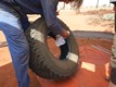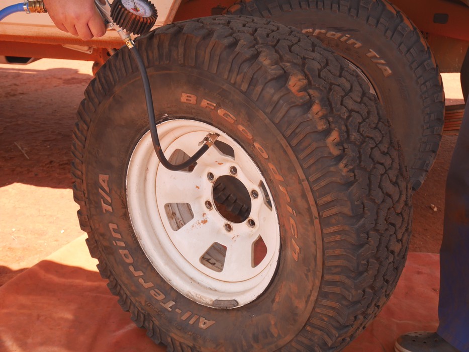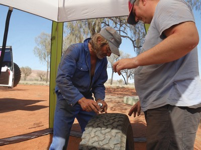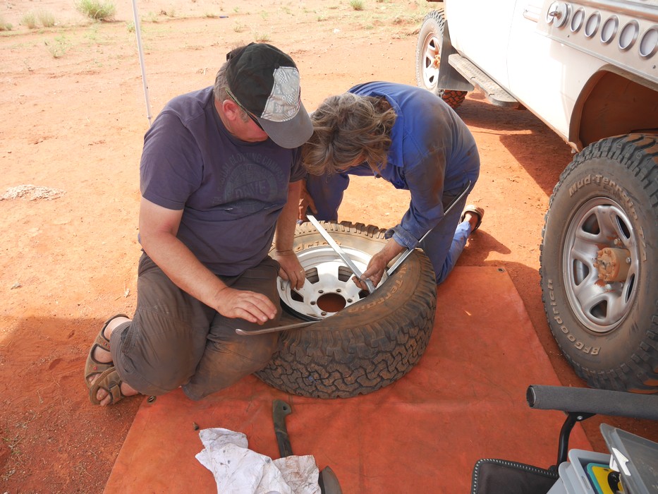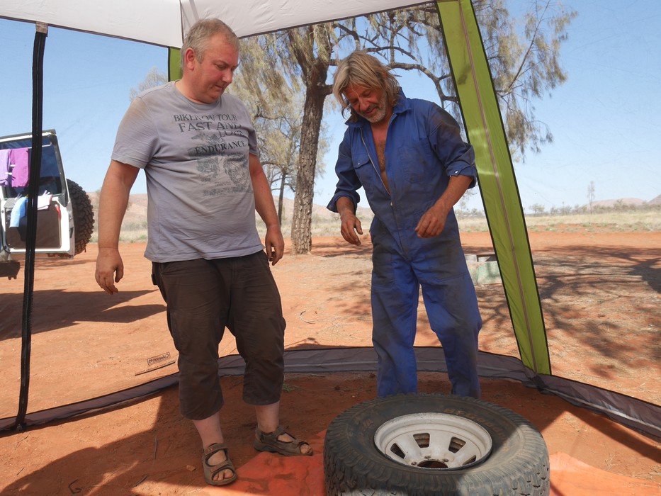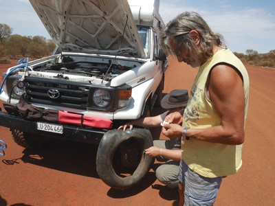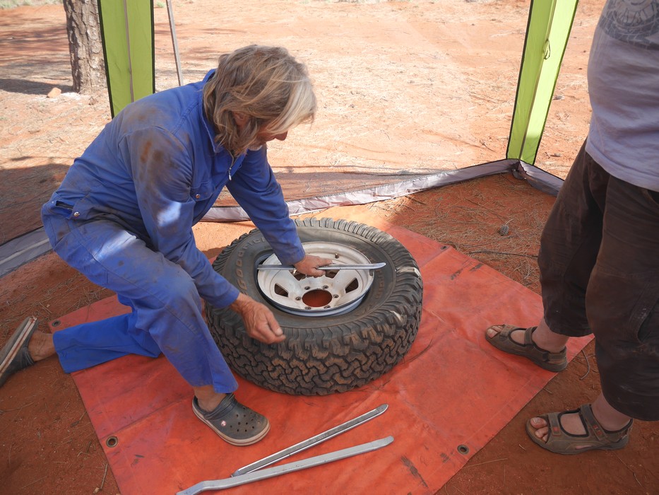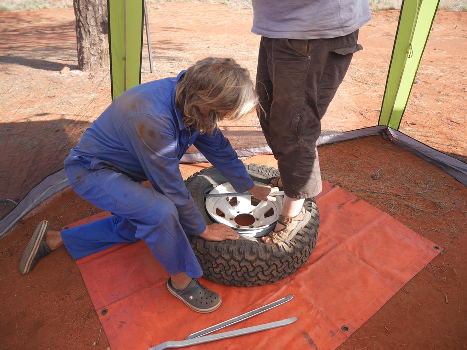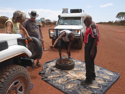 Mit viel Geschick haben die Aborigines den reparierten Schlauch in ihren Reifen montiert.