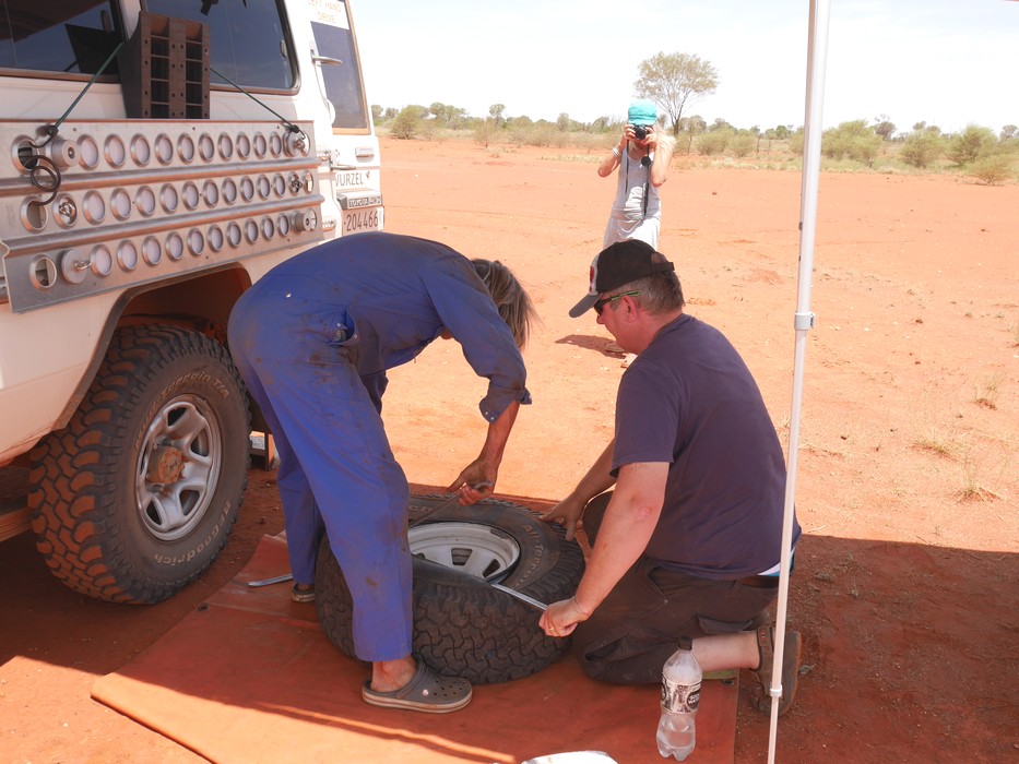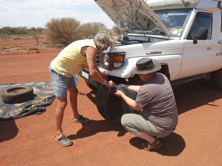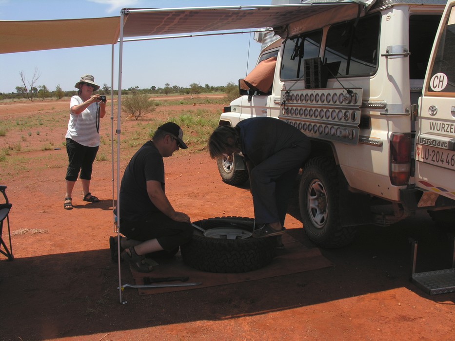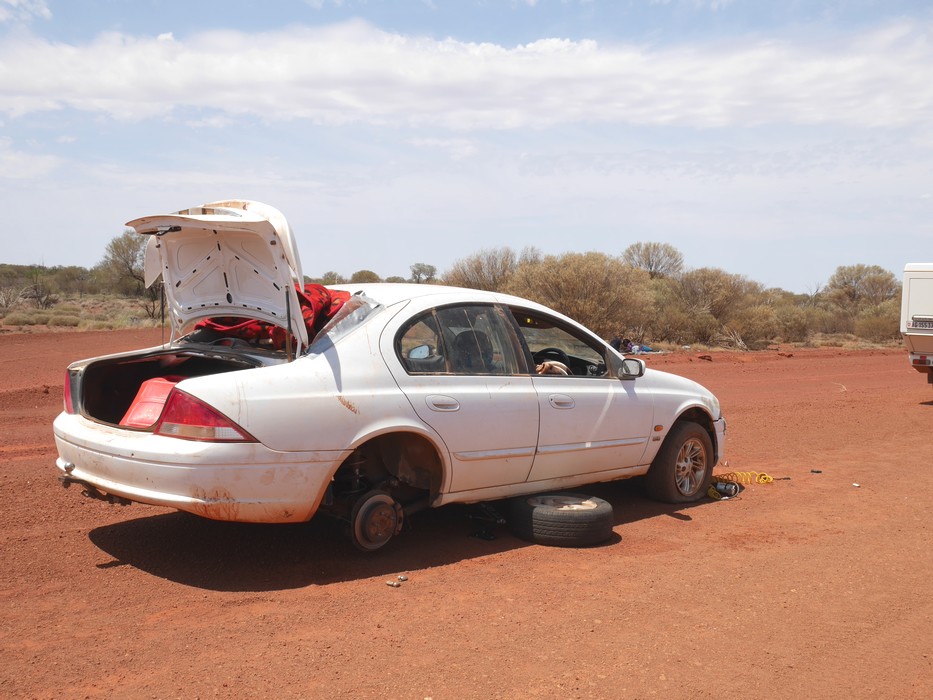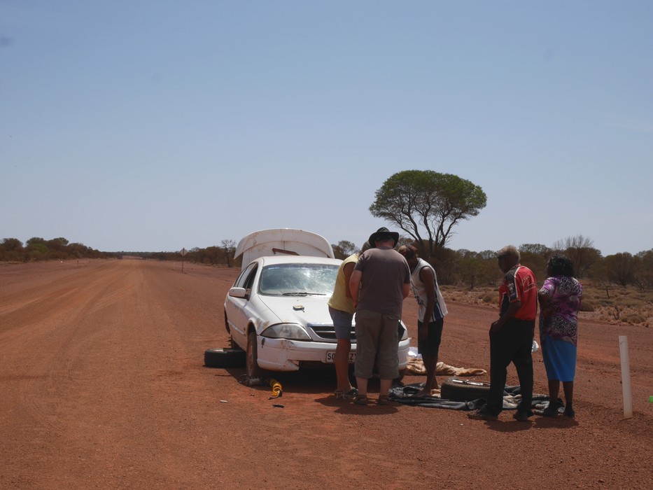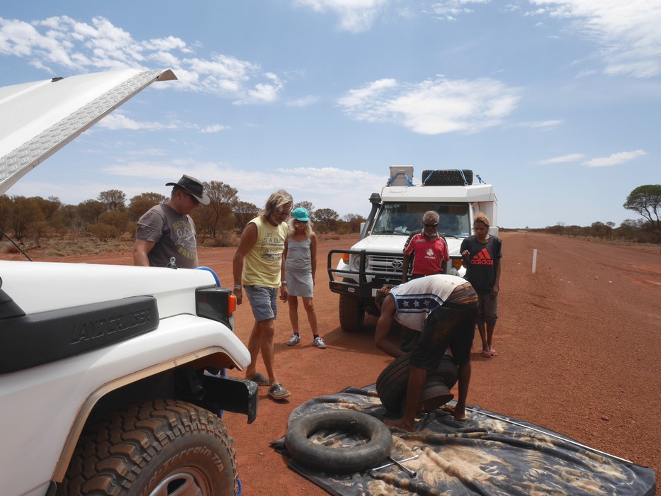 Reifenpanne Nr. 3, diesmal hat es nicht uns erwischt, sondern eine Aborigines Familie mit Ihrem doch sehr ungeeigneten Fahrzeug auf dieser Stecke. Die einheimischen Leute waren sehr schlecht ausgerüstet, weder Schlauchflickzeug noch einen Kompressor hatten sie zur Verfügung.