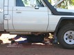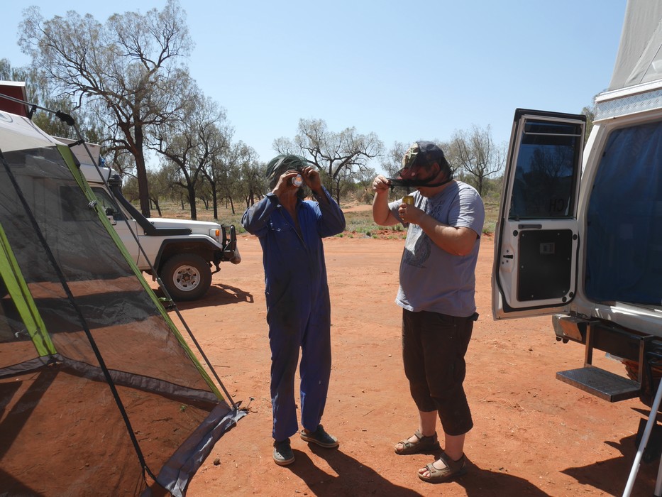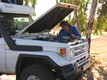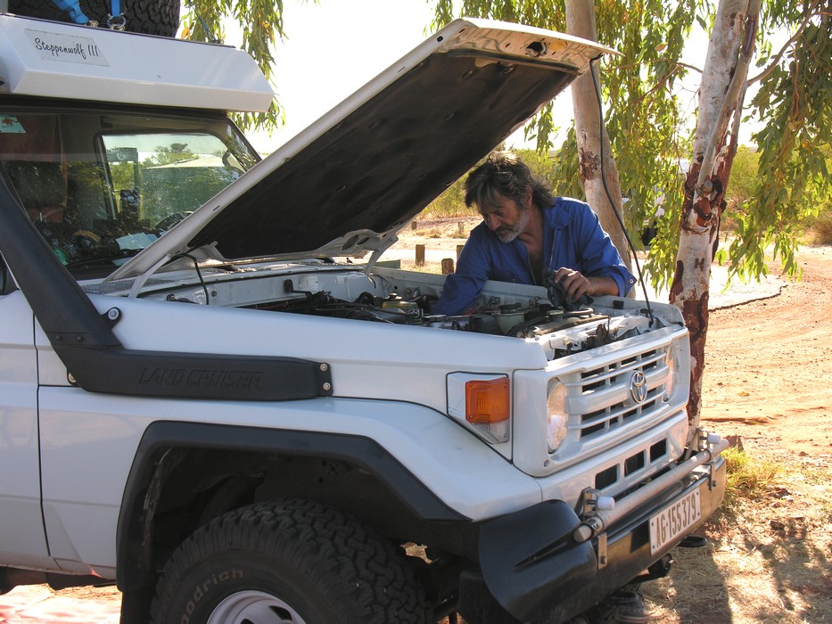 Kaum in Northern Territory angekommen, hatten wir seit dem letzten Service schon wieder 5'500 Km zurückgelegt. Auf einer für uns günstigen Rest Area entschlossen wir uns einen grossen Service am Toyota durchzuführen, da wir insgesamt schon 11'000 Km gefahren sind. Wir konnten sofort loslegen, da wir uns im Vorfeld mit allem eingedeckt hatten, was wir für diesen Service benötigten. Für die gesamten Arbeiten beanspruchten wir einen ganzen Tag, nicht nur, weil es ein grosser Service war, sondern auch, weil sich etliche Besucher dieses Platzes für unsere Arbeiten interessierten und in der Meinung waren, wir hätten eine grössere Reparatur und uns Ihre Hilfe anboten. Als wir dann jeweils die Lage aufklärten, dass es sich um einen Service handelt, entstand immer wieder ein längeres freundliches Gespräch über Autotechnik und unsere Art zu reisen. Die Hilfsbereitschaft der Australier gegenüber Reisenden wird hier sehr ernst genommen.