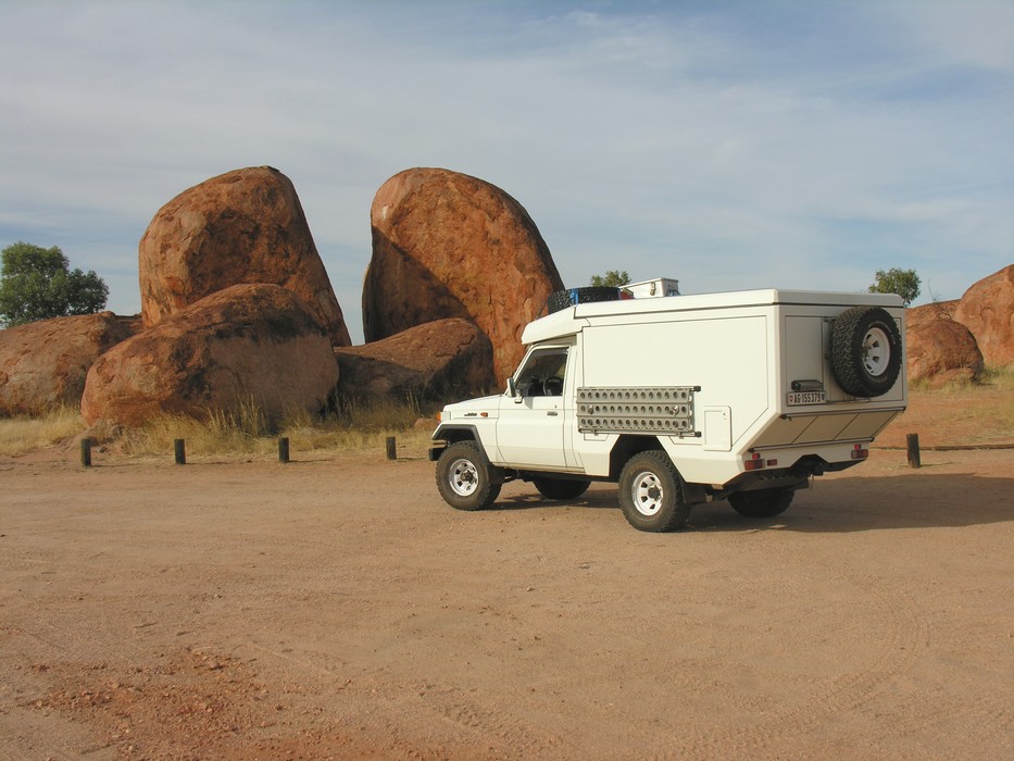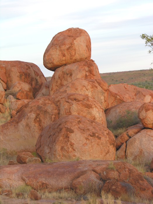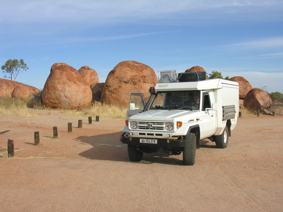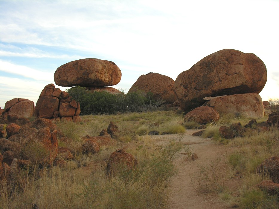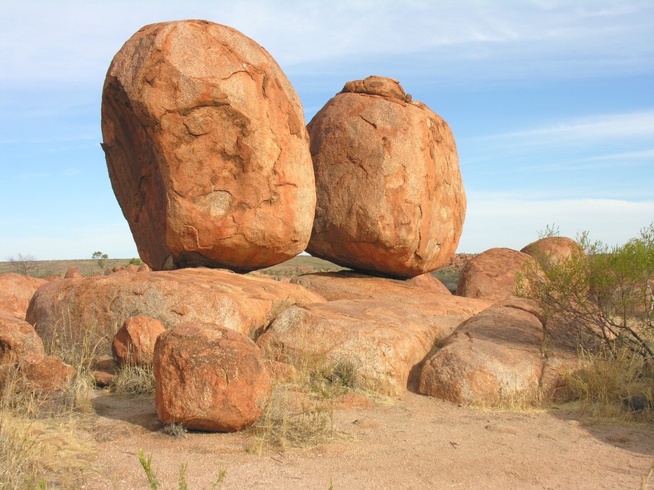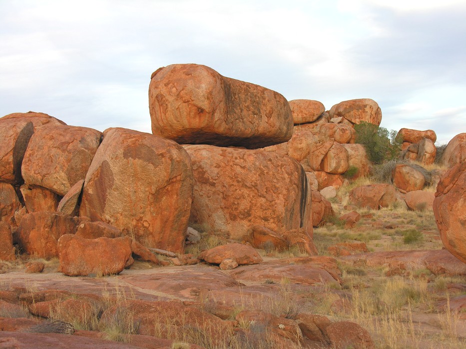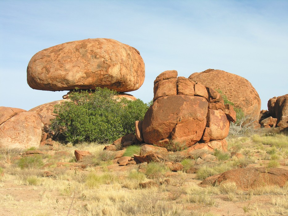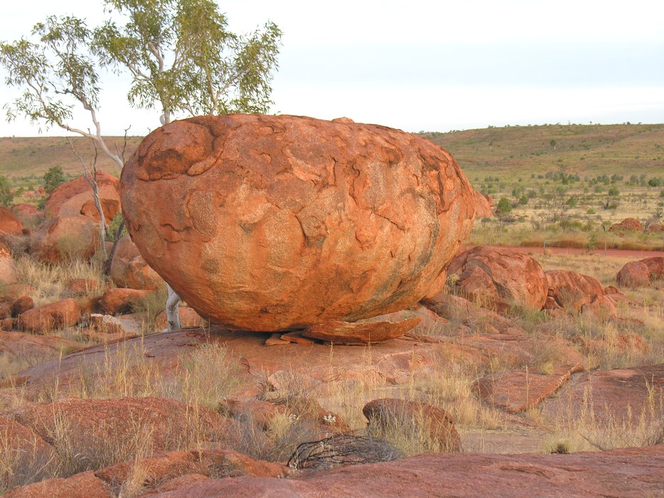 Unweit des Stuart Highways, Richtung Alice Springs befinden sich die gigantischen Devils Marbles. Es sind hunderte teils riesige ovale und runde Steinformationen, verteilt auf 14 Km2.