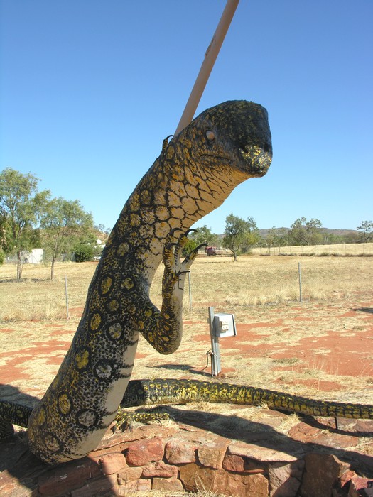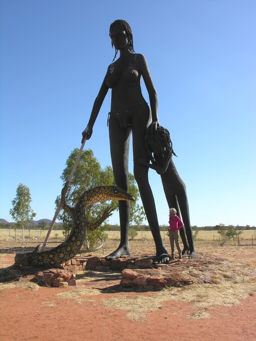 Beim Aileron Roadhouse gab es früher eine Kunstausstellung von Aborigines, die jetzt aber leider geschlossen ist. Nur noch die riesige Statue vor dem Museum kann man betrachten.