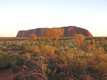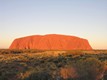 Der Ayers Rock hat am höchsten Punkt eine Höhe von 348 m. Im Hintergrund kann man das Felsmassiv von den Kata Tjutas erkennen, die 35 Km vom Uluru entfernt sind.