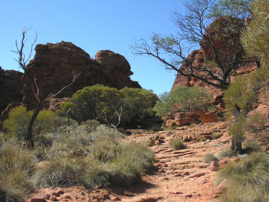 Der Kings Canyon Walk führt nach einem steilen Aufstieg oberhalb der Schlucht auf der Nordseite ca. 3 Km dem Canyon entlang. Er verläuft dann über steile Stufen die Wand hinunter in die Schlucht, über den Kings Creek, von wo aus man einen Abstecher zum grünbewachsenen Garten Eden machen kann. Der Rückweg führt auf der Südseite durch die Sandsteinkuppen von Lost City zurück zum Ausgangspunkt, mit einer gesamten Länge von 6,5 Km.