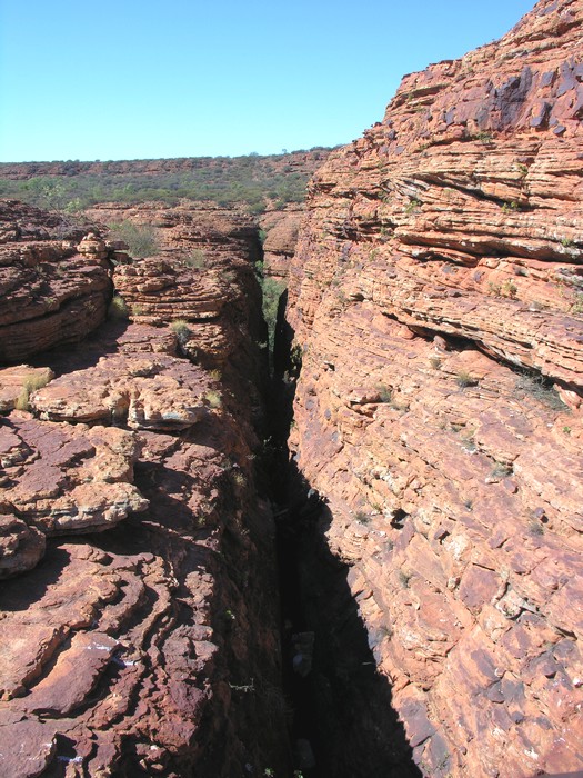 Ein besonders tiefer Spalt wurde durch Wind, Regen und Überschwemmungen immer tiefer und breiter erodiert. Als dieser Spalt den weicheren Carmichael Sandstein erreichte, wurde dieser schneller erodiert als der darüberliegende Meerenie Sandstein, was diesem die Auflage raubte und durch schubweises Einbrechen der oberen Gesteinsschichten über Millionen von Jahren den Kings Canyon formte.