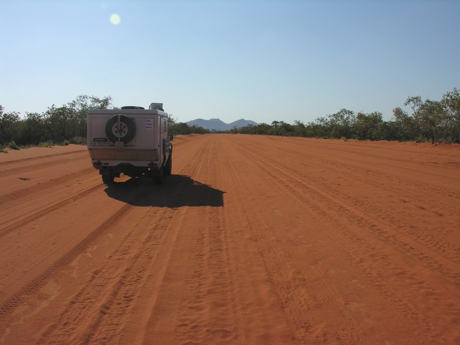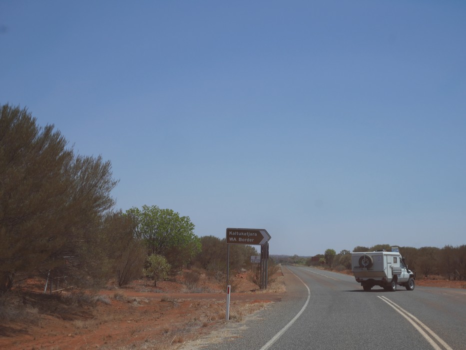 Unmittelbar nach den Olgas biegt man Richtung Westen ab. Bis zur westaustralischen Grenze sind es 210 Km, von der Grenze bis Laverton dann noch 920 Km.