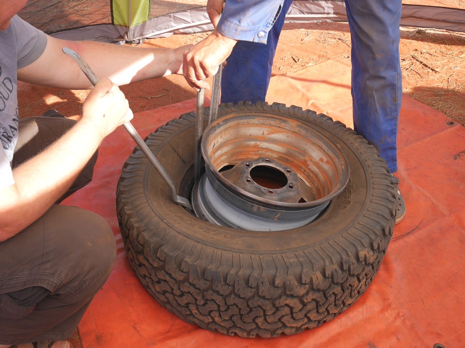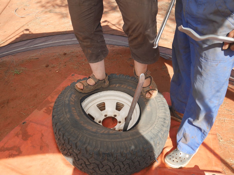 Mit sehr simplen und einfachen Werkzeugen haben die Aborigines den defekten Schlauch vom Rad ausgebaut. Unsere Aufgabe war es nun den Schlauch zu reparieren.