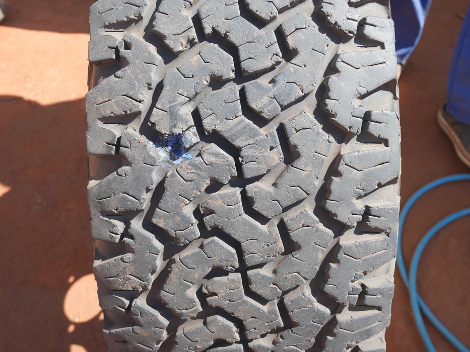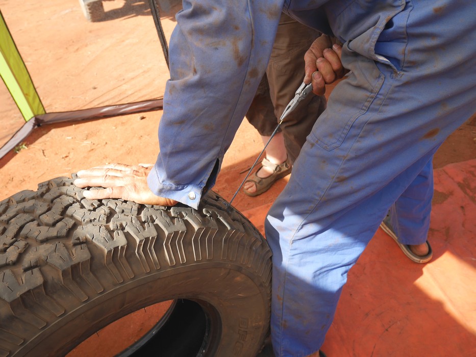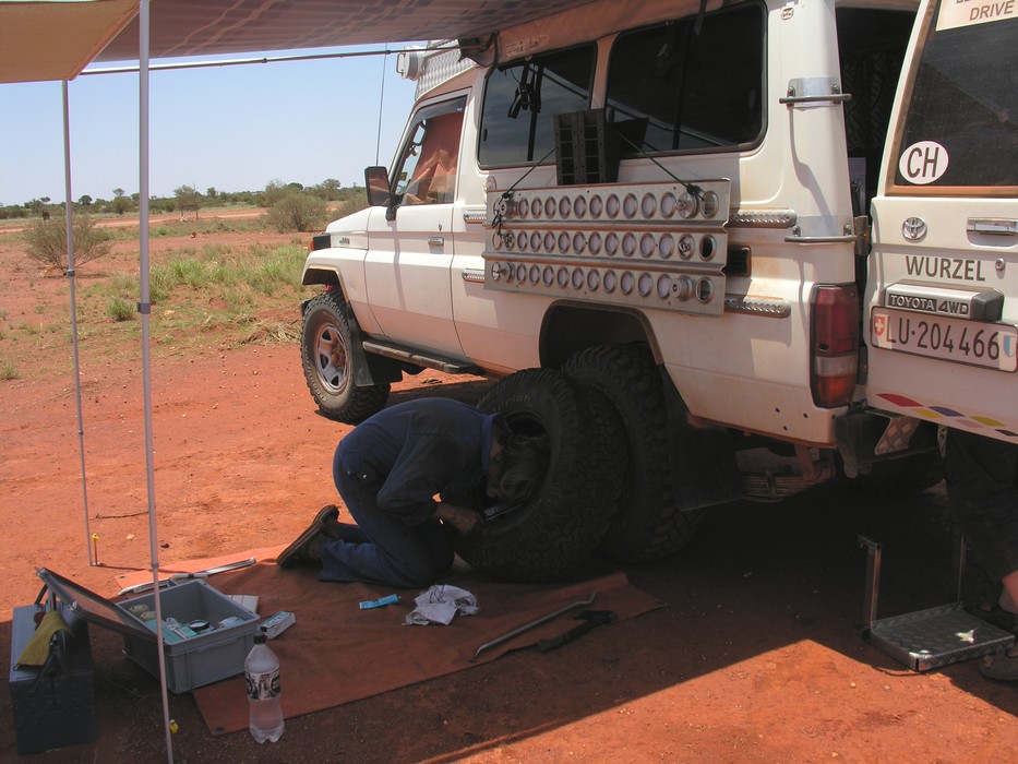 Weit kamen wir nicht, Reifepanne Nr. 2 folgte, diesmal hinten rechts. Wir sind knapp 50 Km gefahren seit der ersten Reifenpanne und die Sonne schien uns wieder unbarmherzig auf die Köpfe. Damit wir im Schatten arbeiten konnten, stellte Marco freundlicherweise an seinem Toyota die Markise auf. Zum Glück hatten wir am Vortag den Reifen repariert und sind nicht mit dem Reserverad weiter gefahren, ansonsten müsste ich hier 2 Reifen flicken um wieder ein intaktes Ersatzrad zu haben.