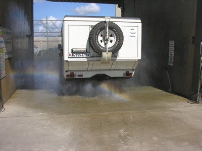 Da wir die letzten 12 Tage oft im Spülsaum am Meer entlang gefahren sind, hat sich am kompletten Auto eine Salzschicht gebildet. Nun wird hier an einer speziellen 4WD Underbody Car Wash-Anlage das Auto intensiv von unten vom Salz befreit.