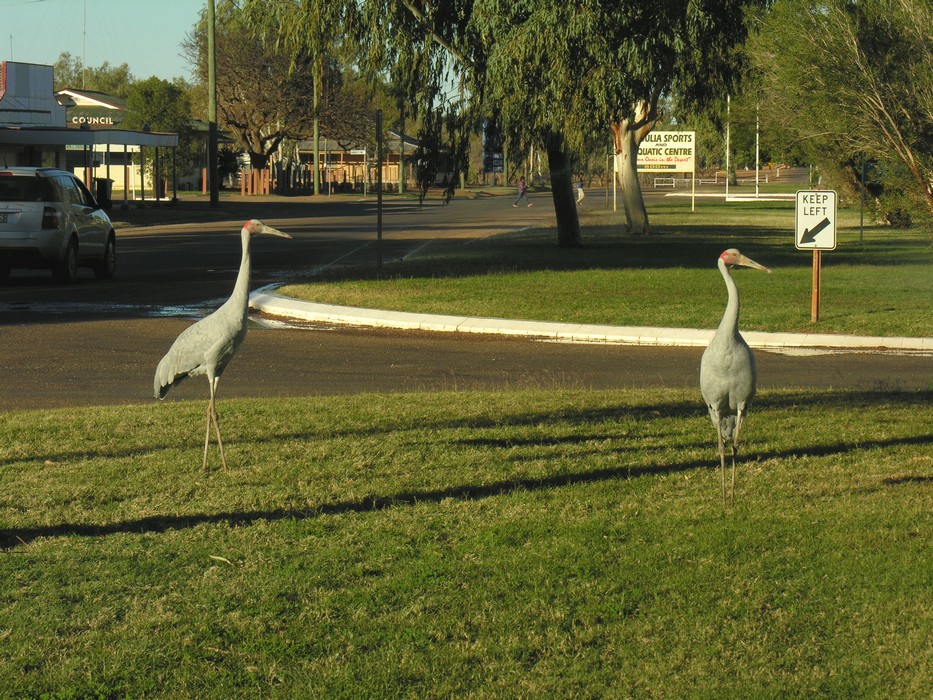 Von Birdsville sind wir nach Boulia gefahren, um uns nach der Durchquerung der Simpson Desert mit Lebensmittel einzudecken. Direkt gegenüber dem Supermarkt, auf einer Wiese, entdecken wir diese Brolgakraniche, die mitten in der Kleinstadt zwischen den Autos und Leuten herumspazierten.
