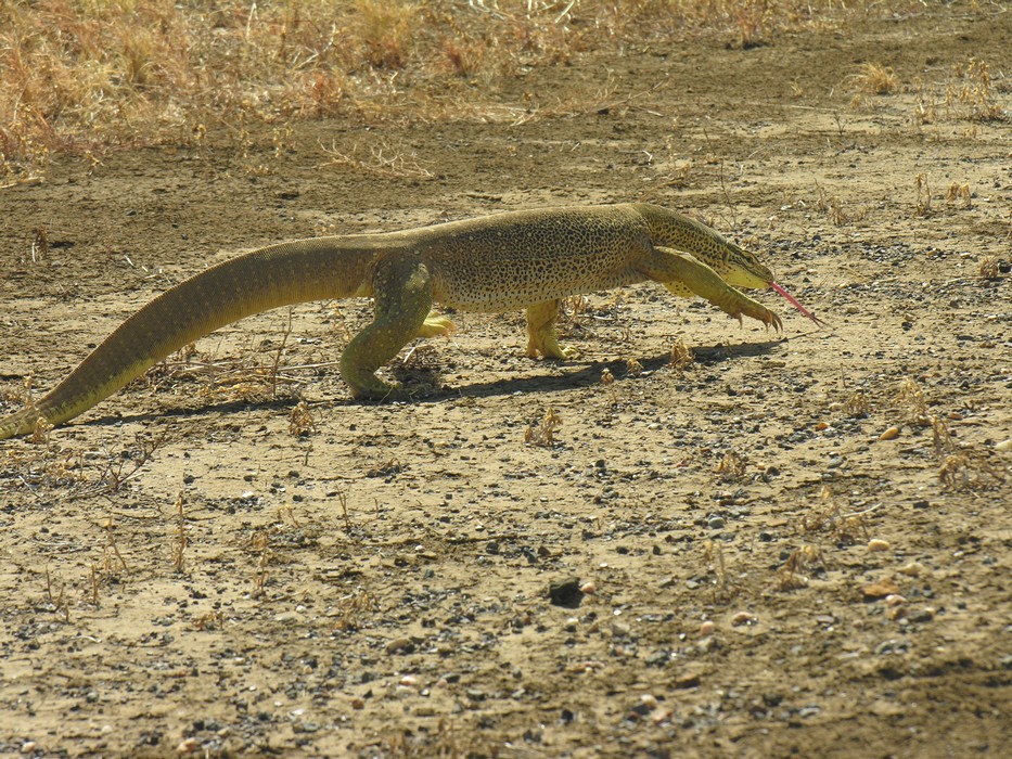 In der sehr abgelegenen Gegend, nicht weit vom Pistenrand, entdeckten wir diesen Waran. Sie leben häufig im Landesinnern und in den Regenwäldern. Das Tier hatte etwa eine Länge von 1.30 m