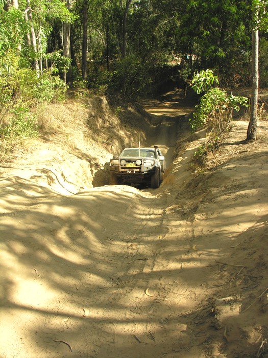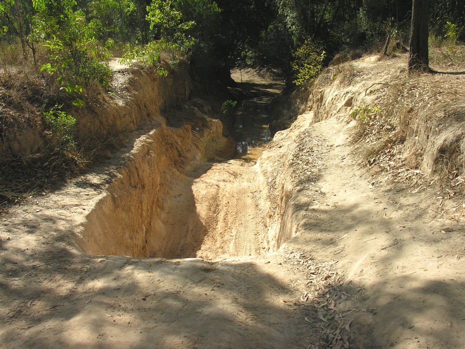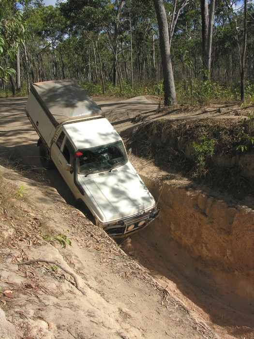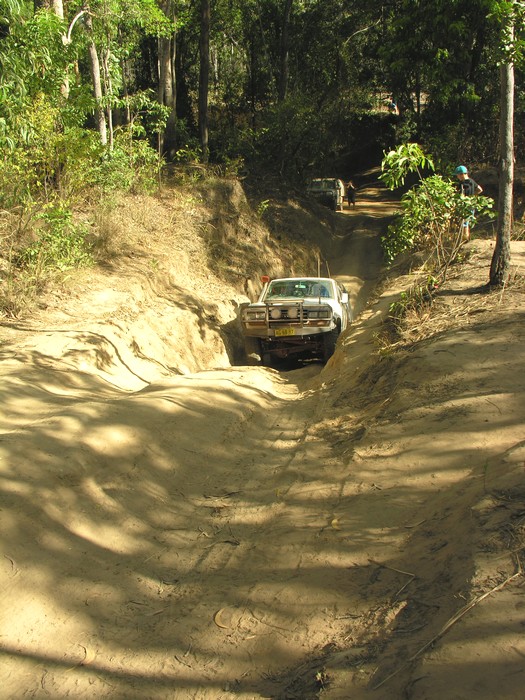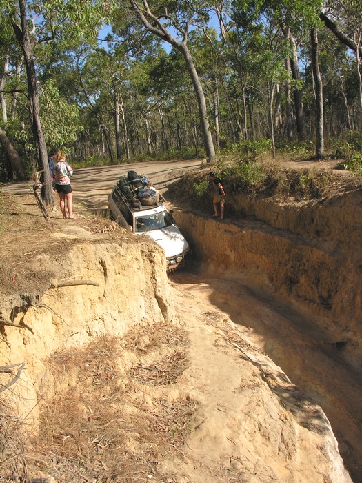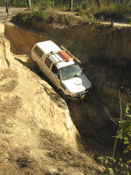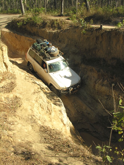 Der Roadhouse Besitzer von der Bramwell Station erzählte uns, dass die Youtube Filme im Internet "Gunshot Cape York " einen unglaublichen Einfluss auf die Offroadfahrer bewirkten. Diese Animation löste einen regelrechten Run auf den Old Telegraph Track aus, und somit wurde der Einstieg zum Palm Creek in den letzten 2-3 Jahren völlig ausgefahren zu einem schmalen tiefen Graben.
