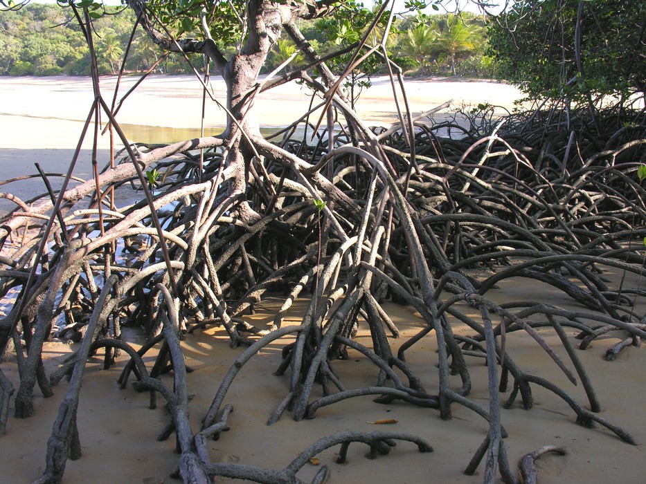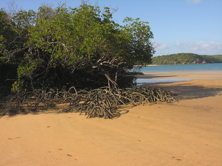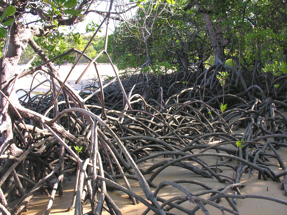 Bei Ebbe konnten wir am Strand entlang spazieren bis zu den Mangroven. Sie haben sich hervorragend an den Gezeitenwechsel und das Salzwasser angepasst. Die Sümpfe sind Lebensraum unzähliger Tiere wie Muscheln, Krebse, Vögel und Krokodile.