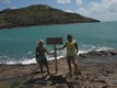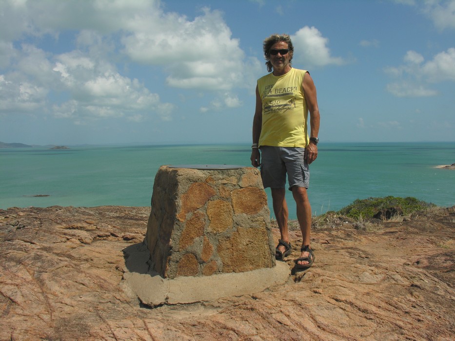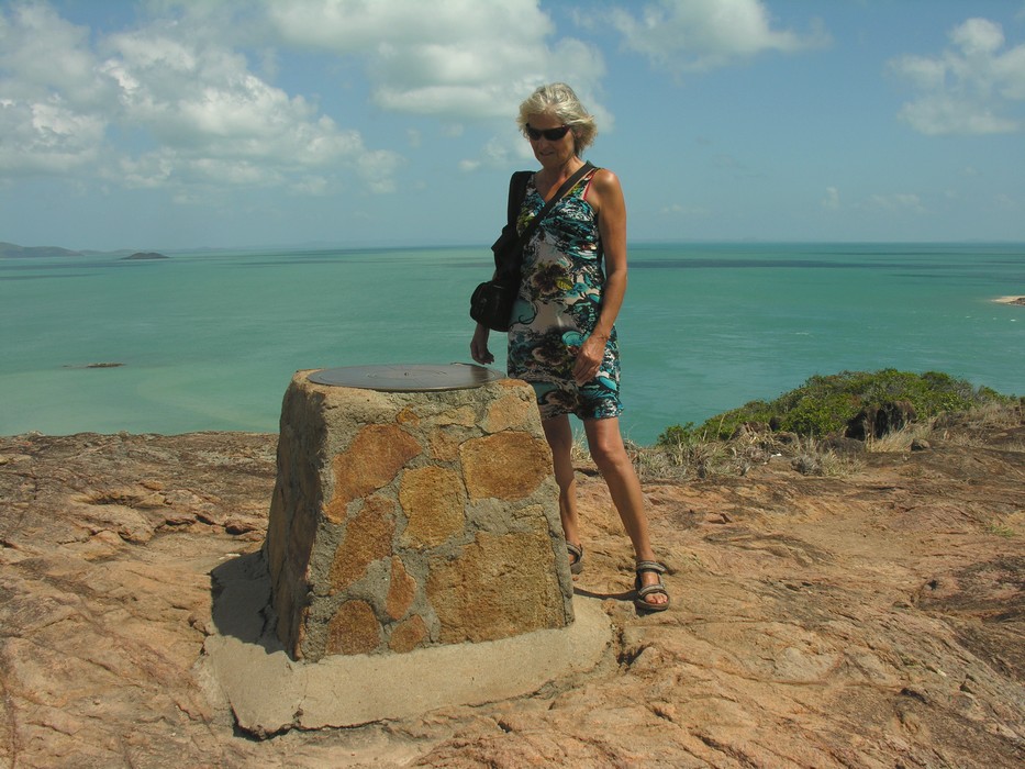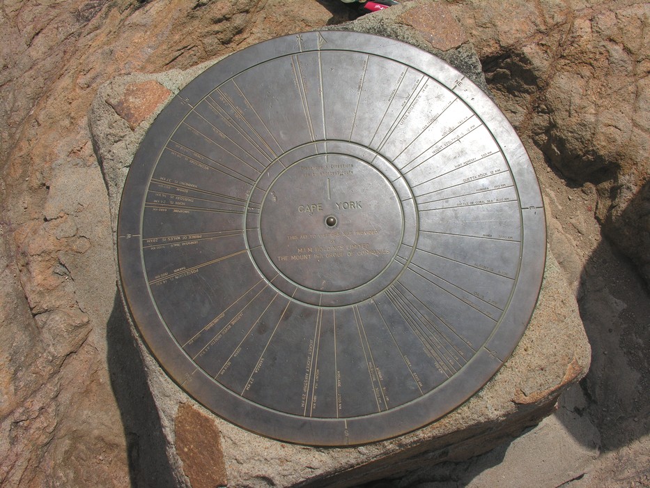 Auf dem Hügel befindet sich ein Markstein mit einer Tafel "Cape York" und was sich in welcher Richtung befindet.
