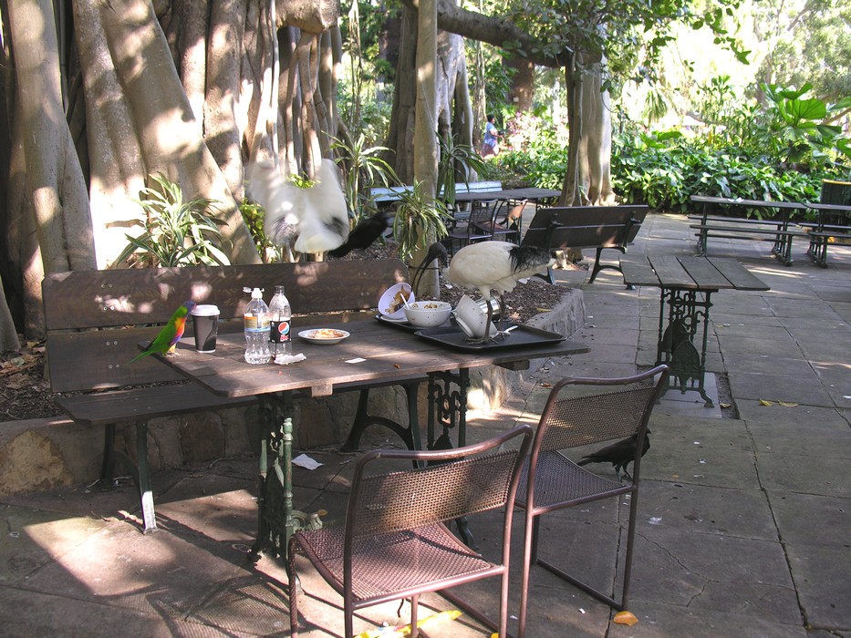 Im Restaurant des Botanischen Gartens bedient sich die Vogelwelt an den Resten die die Gäste übrig lassen, sogar Pommes Frites werden von den Tieren verzerrt.