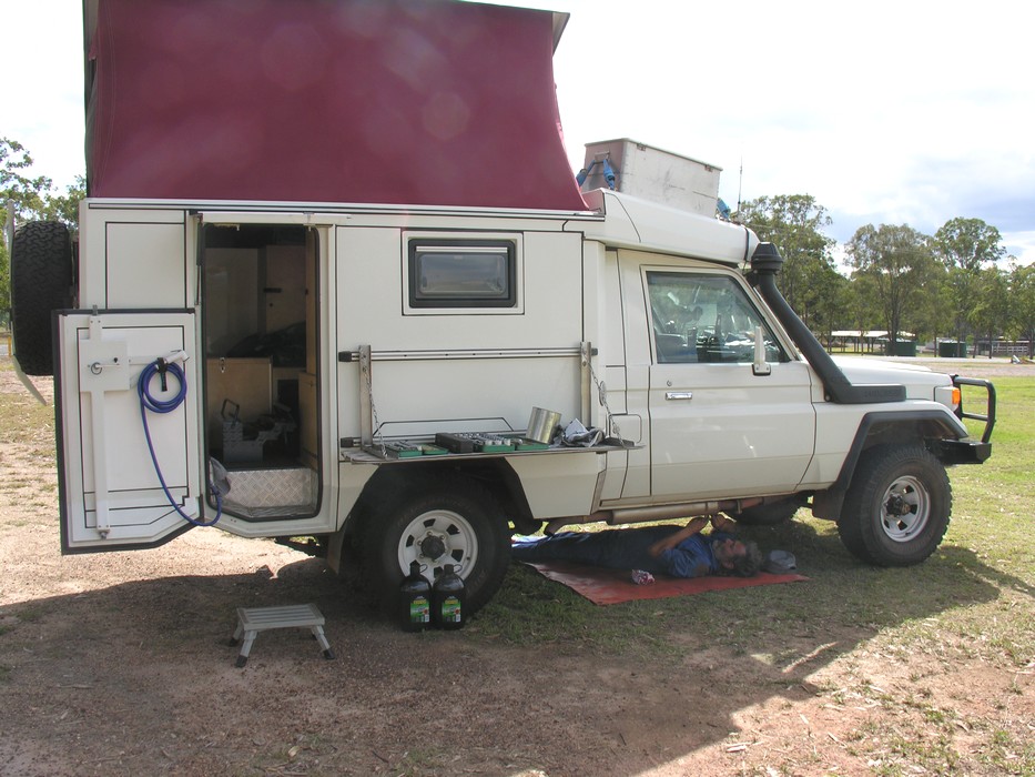 Nach fast fünfmonatiger Reise haben wir auf dem 5. Kontinent 16'000 Km mit unserem Fahrzeug zurückgelegt. Es drängte sich nun wieder ein kleiner Service auf, den wir in Ayr an einer Tankstelle durchführen durften. Ich wurde schon öfters darauf angesprochen, weil ich alle 5'000 Km eine Inspektion am Fahrzeug vornehme. Die Leute meinten, dies sei bei einem Toyota nicht nötig, bzw. übertrieben. Diese kleine Inspektion bewies aber prompt das Gegenteil. Als ich die Vorderachse genauer unter die Lupe nahm, stellte ich ein Spiel am Rad rechts vorne fest. Im ersten Augenblick hatte ich eine Schrecksekunde, da ich der Meinung war, dass die Achsschenkellager ausgeschlagen sind. Beim demontieren der Freilaufnabe bemerkte ich aber sofort, dass die Einstellmutter vom Radlager, die mit einem Blech gesichert ist, sowie die Kontermutter sich gelöst hatten. Die Kontrolle der Radlager zeigte keinerlei Befund. Ich stellte das Spiel ein, sicherte die Mutter mit einem neuen Blech und zog die Kontermutter fest an, und das Spiel am Rad war aufgehoben. Die Pisten in Australien sind wirklich sehr schlecht, ich hatte noch nie solch einen Fall auf all unseren Afrikareisen. Nicht auszudenken, was für eine Beschädigung an der Radnabe entstanden wäre, wenn ich dieses Spiel nicht festgestellt hätte, und wir ins Cape York hoch gefahren wären, wo die Pisten nach Aussage von anderen Reisenden extrem schlecht sind.