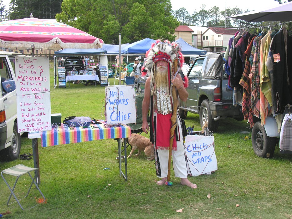 Am Samstagsmarkt in Gympie haben wir diesen Häuptling angetroffen. Er wollte uns zu einem positiv denkenden Leben führen mittels Religion. Wir hörten ihm zu und amüsierten uns. Dankend verabschiedeten wir uns von dem doch sehr friedlichen und freundlichen Häuptling.