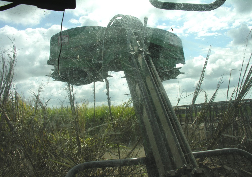 Da der Führerstand der Zuckerrohr Erntemaschine zwei Plätze hat, durften wir für eine Fahrt hin und zurück mitfahren. Wie staubig und ruppig diese Arbeit ist, bemerkten wir erst, als wir in der Maschine mitfuhren.