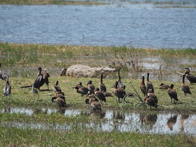Es scheint so, als hat das Krokodil seine Mahlzeit bereit gehabt, und die Vögel wissen es.