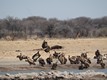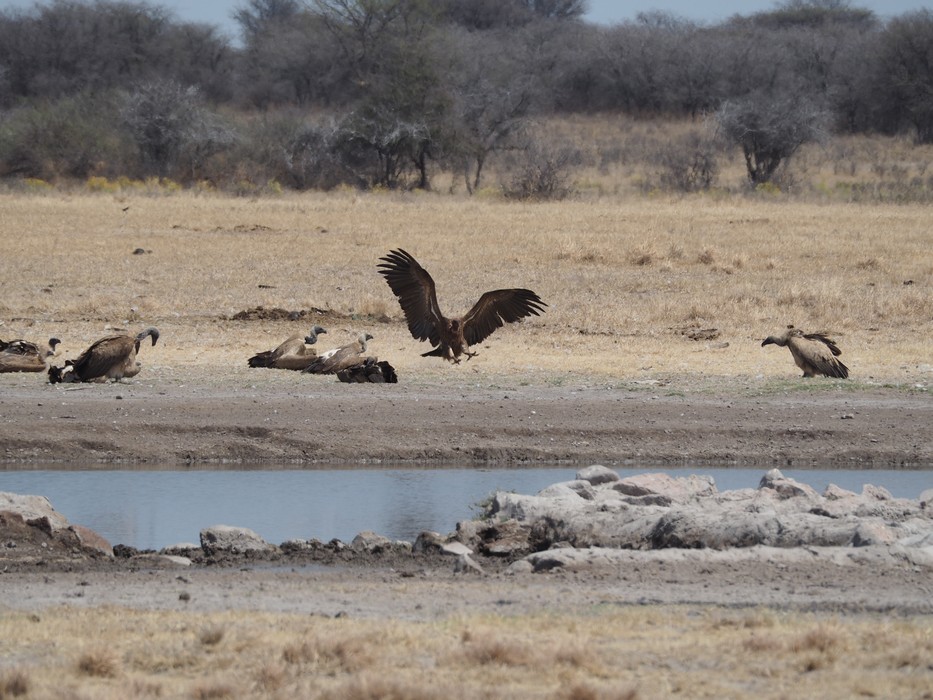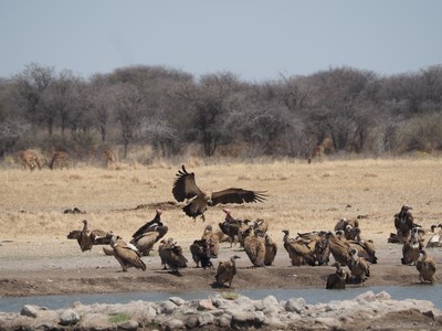 Am Wasserloch der Rhinos versammelte sich eine Anzahl von Geiern.