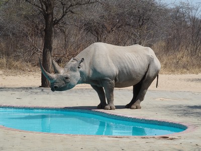 Da hat wohl ein Rhino den Swimmingpool mit dem Wasserloch verwechselt. Die Picknick Area wird durch keinen Zaun geschützt, so haben auch die Tiere jederzeit Zugang.