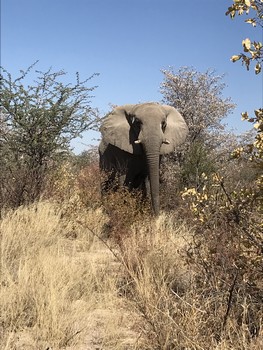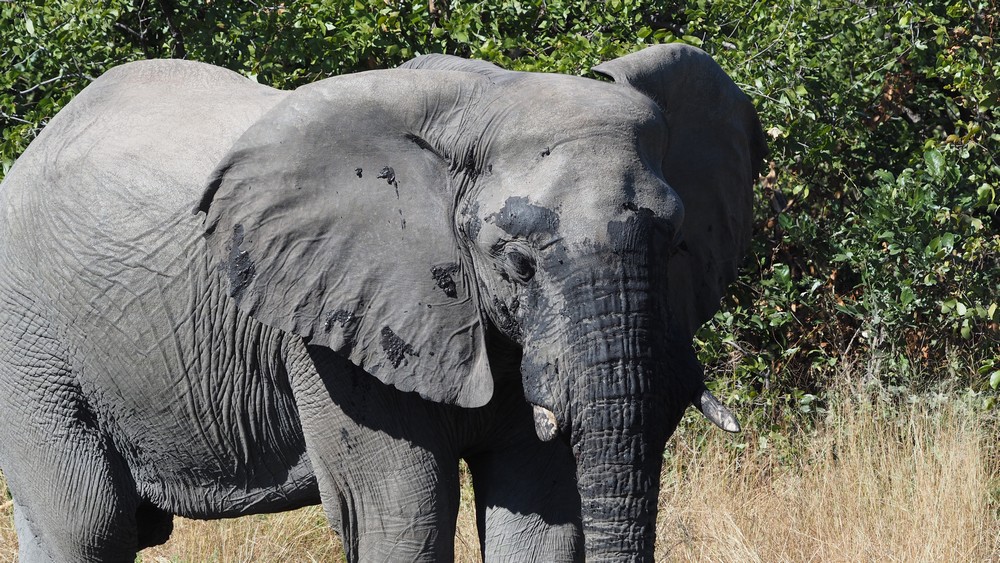 Mit etwas Glück begegneten wir diesem Elefant direkt am Pistenrand, nur etwas weiter zurück, und er wäre im dichten Busch für uns nicht sichtbar.
