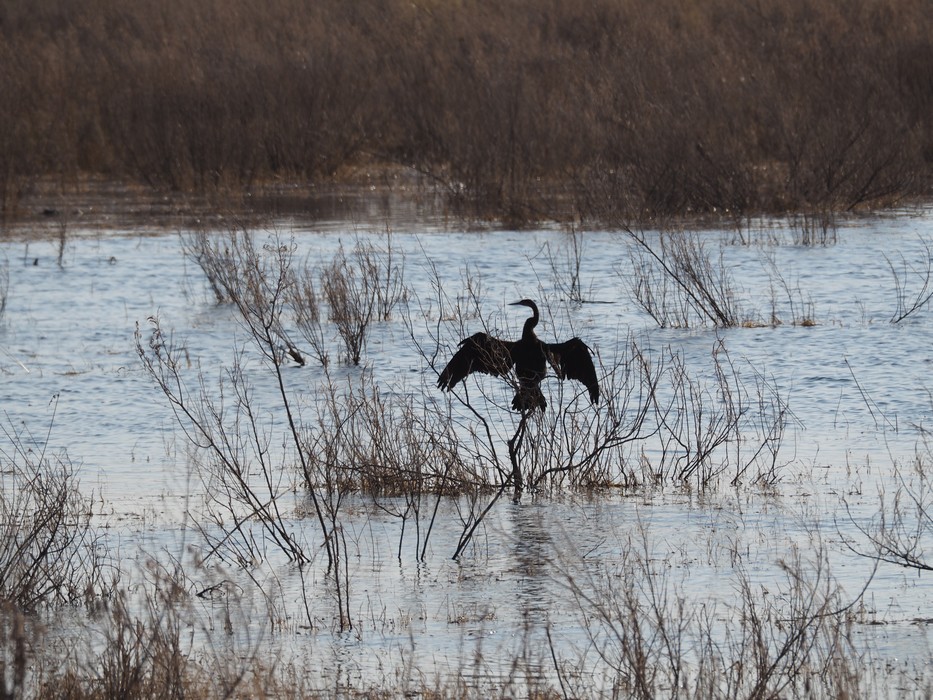 Der Fischreiher trocknet seine Flügel nach der Jagt.