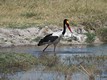 Der farbenfrohe, afrikanische Jabiru Storch ist auf Nahrungssuche.