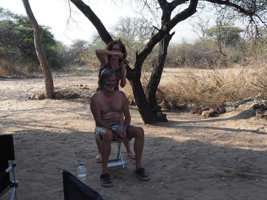 Auf dem Campingplatz vom Moremi Gorge bot mir Birgit einen Haarschnitt an, was ich natürlich nicht ablehnte.