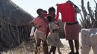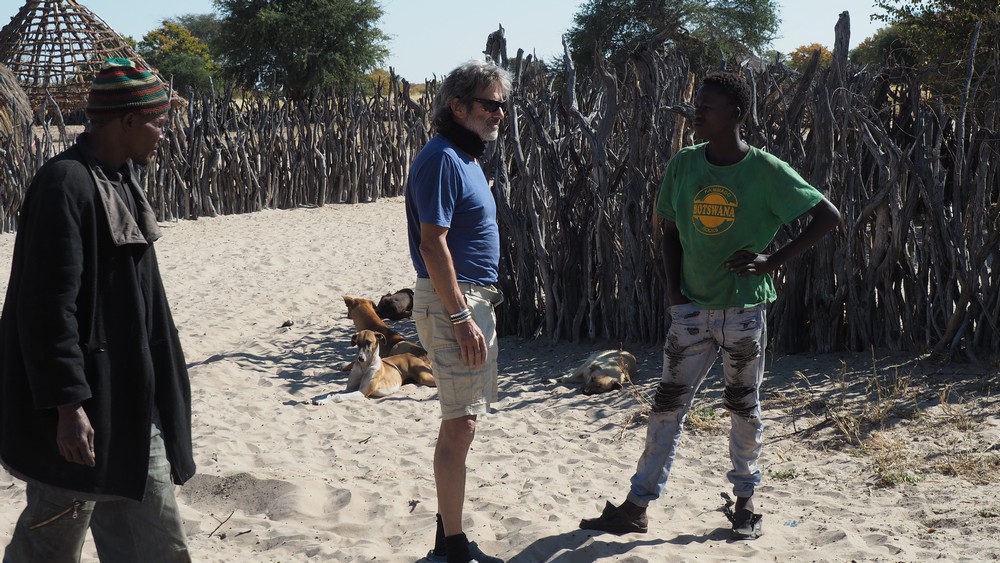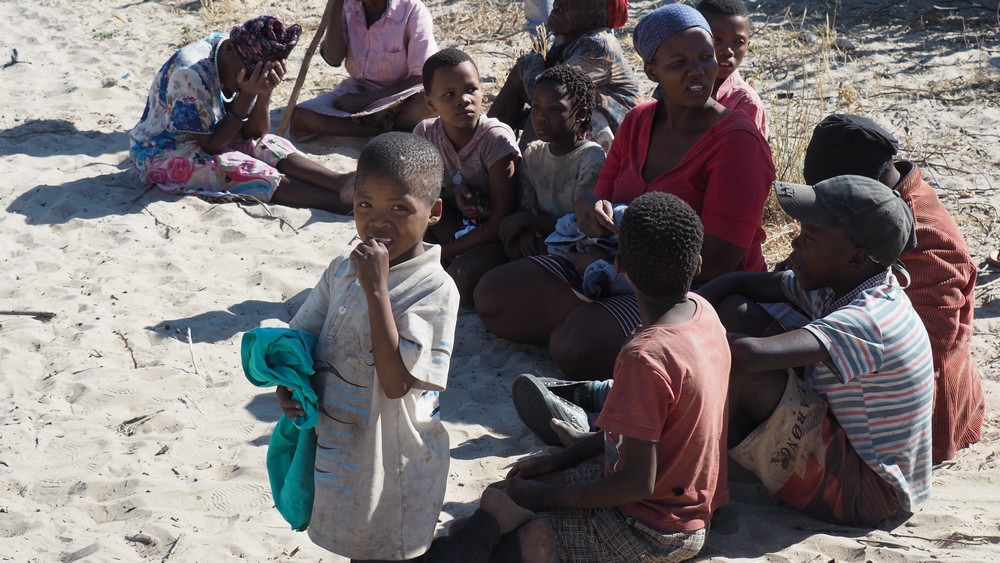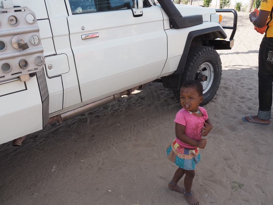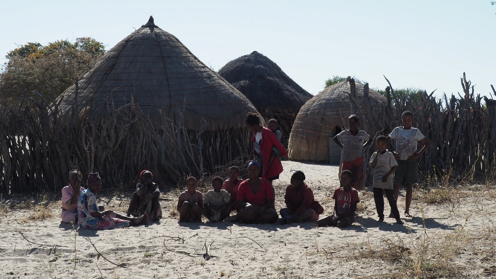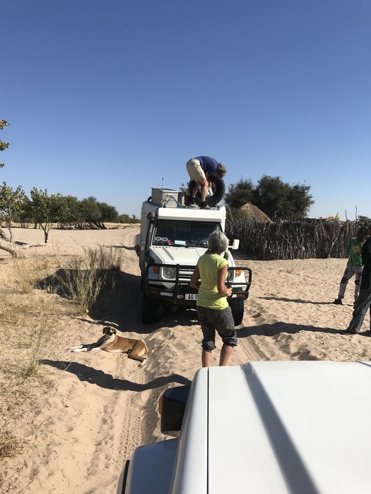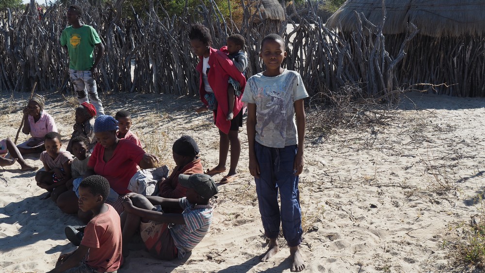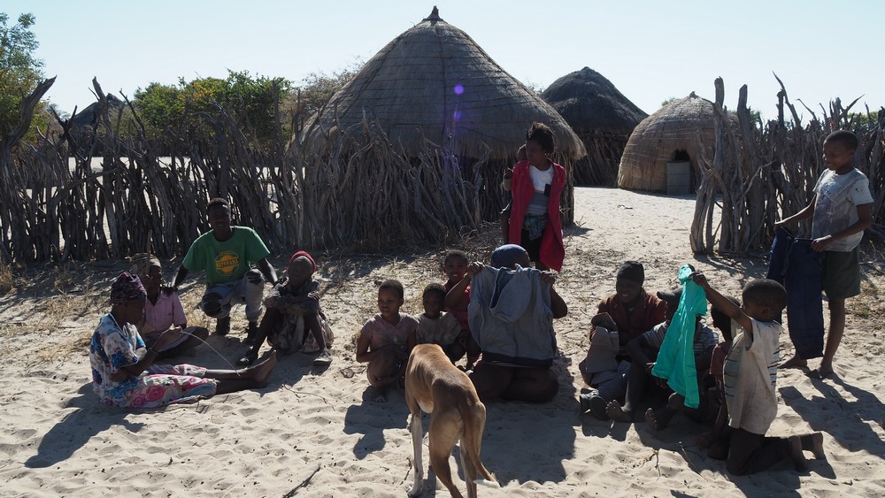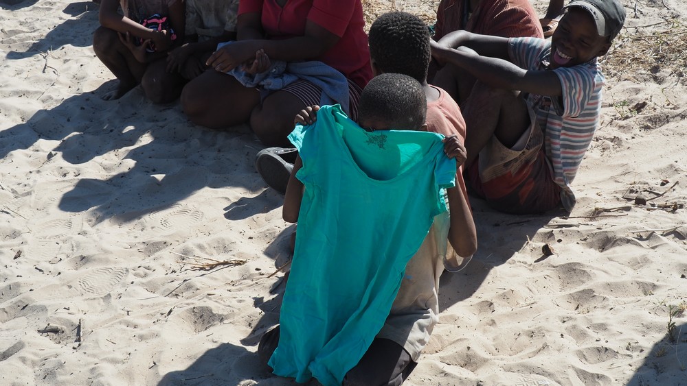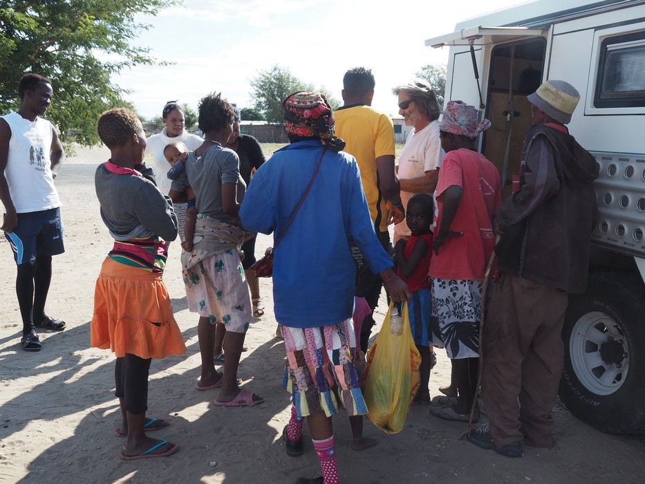 Bei einem Dorf in der Central Kalahari, dass von den San (Buschleute) bewohnt wird, stoppten wir. Auf dem Dach, im Reservereifen, hatten wir Kinderkleider die wir gerne an die Dorfbewohner abgaben.