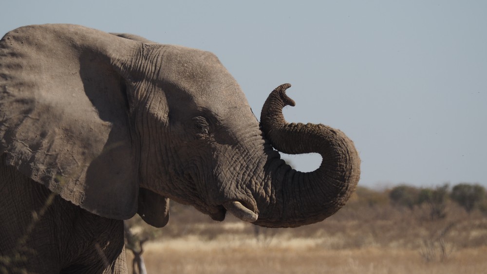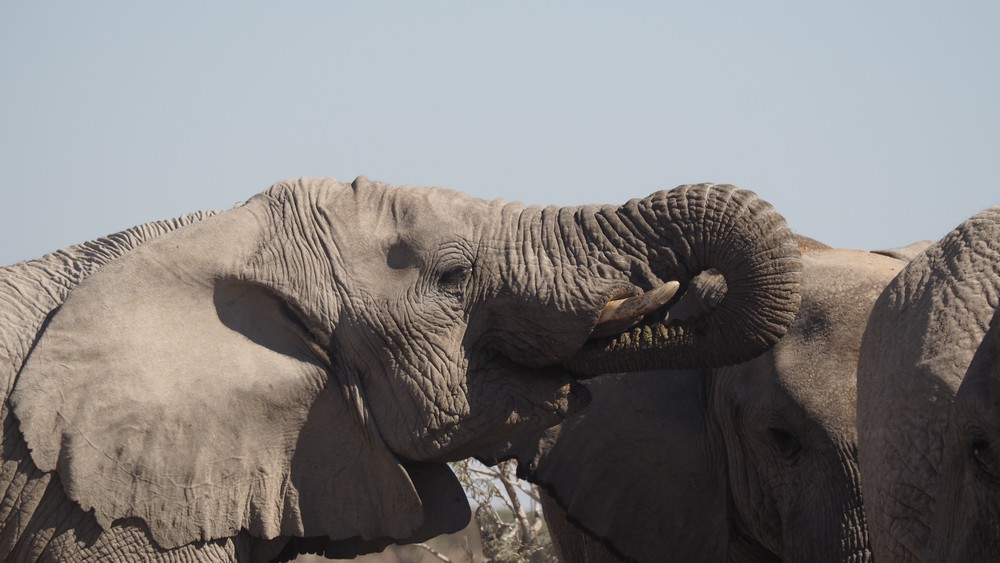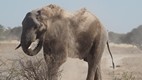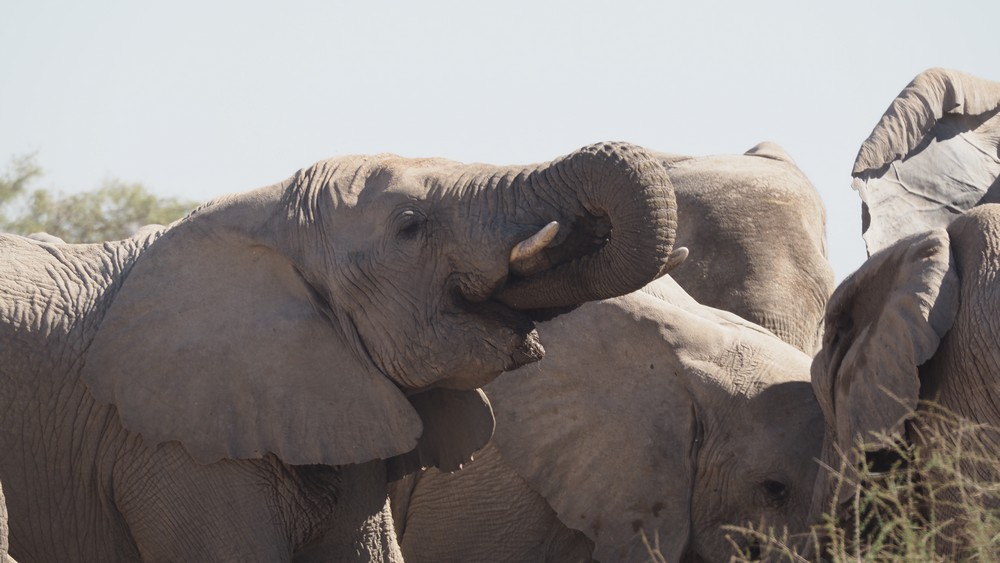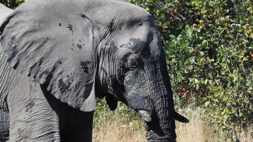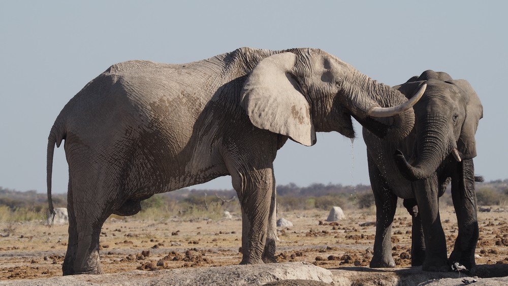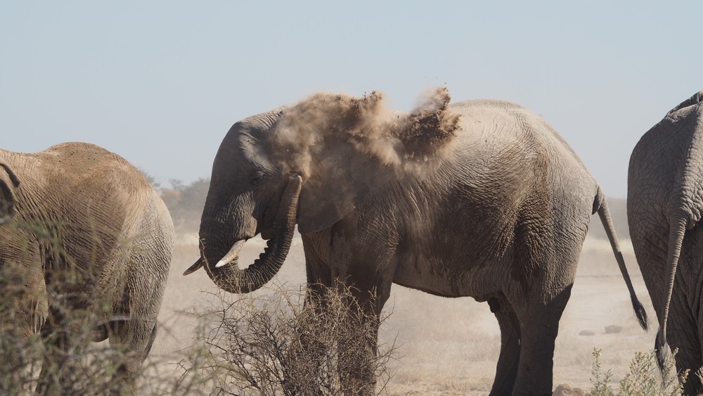 Für ein Schlammbad, was die Elefanten eigentlich lieben für ihre Hautpflege, reichte es nicht. Als Alternative haben sie mit dem Rüssel den Staub vom Boden aufgenommen und über den ganzen Körper verteilt.