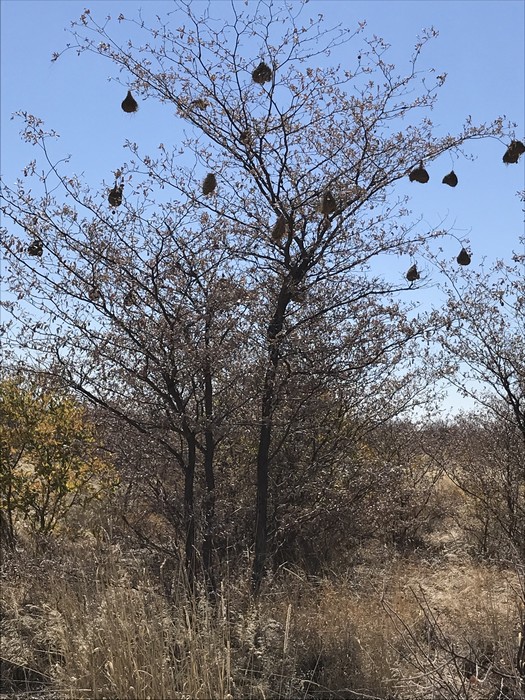 Wie Christbaumkugeln hängen die Nester der Webervögel an den Bäumen.