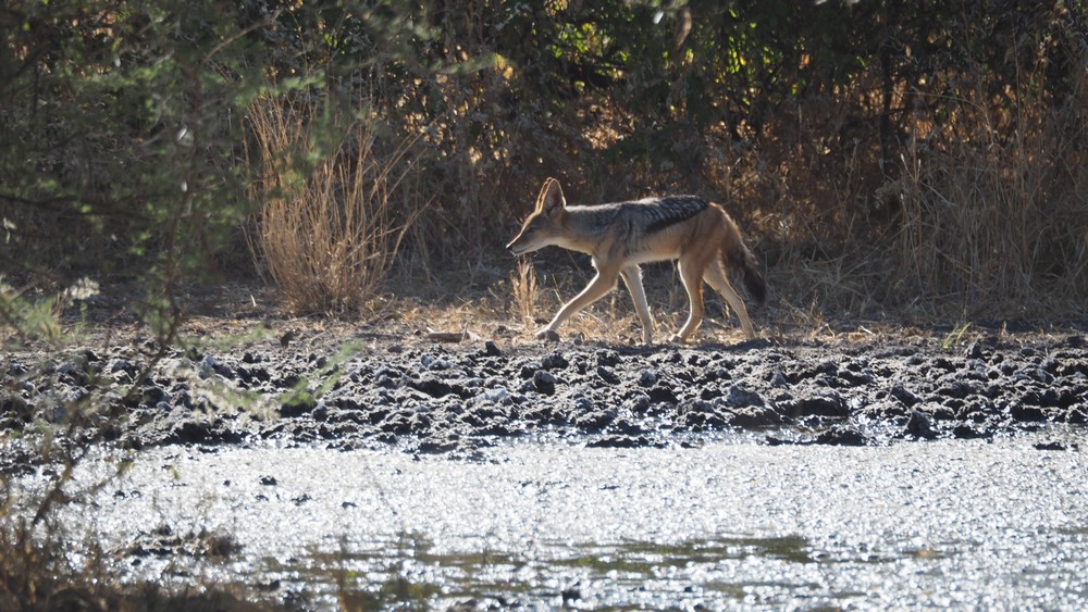 Sehr vorsichtig näherte sich ein Schakal dem Wasserloch, aber immer ein Auge auf die Löwen gerichtet.