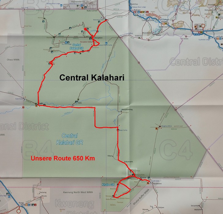 Durchquerung der Central Kalahari vom Süden nach Norden: Total gefahrene Km 650