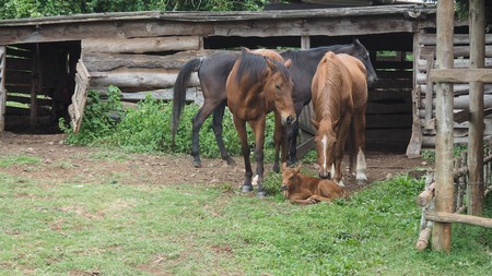 Das Kalb wir liebevoll umsorgt von den Pferden.