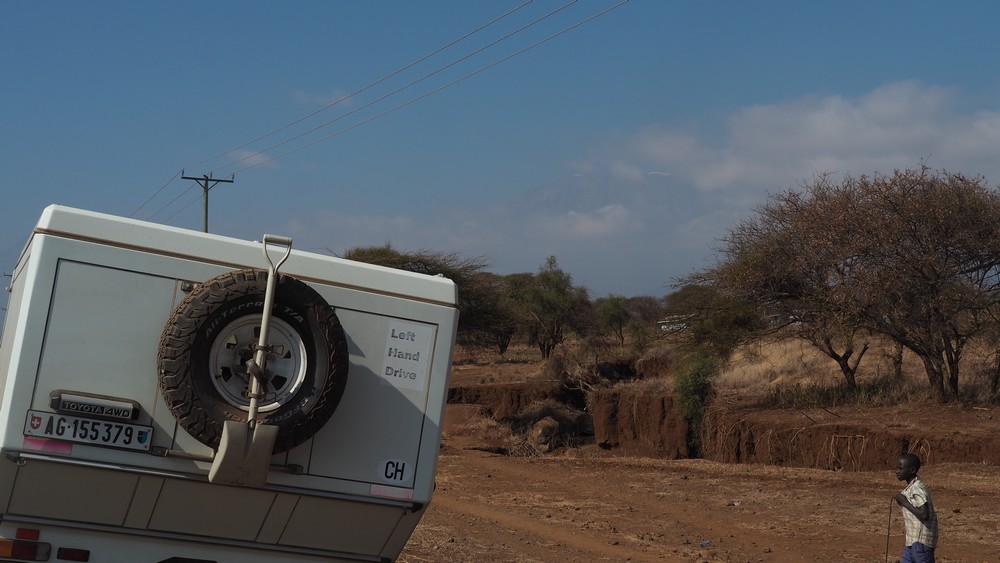 Wir sind in Tansania, östlich vom Kilimanjaro Richtung Norden, an die kenianische Grenze gefahren. Der Grenzübertritt an diesem kleinen Grenzort verlief reibungslos. Am nächsten Tag, kurz nach der Grenze hatte wir Glück, dass der Gipfel des Kilimanjaros von Kenia aus schwach sichtbar war. Von Tansania aus konnten wir ihn nie sehen, da er permanent von den Wolken verdeckt wurde.