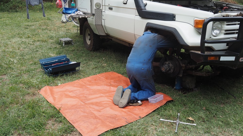 In Tansania und Kenia mussten wir bedingt durch die hohe Anzahl von Humps, zum Teil alle 5 km mindestens 2 Stk. in Folge, unser Fahrzeug bis auf 15 km/h herunter bremsen. Dies hatte zur Folge, dass sich die vorderen Bremsbeläge überdurchschnittlich abnutzten. Gerade mal am nördlichsten Punkt von der Umrundung des Mount Kenia angekommen, mussten wir uns neue Bremsbeläge besorgen. Wie es in Afrika so ist, erhielten wir zuerst die falschen Bremsbeläge. So etwas stellt man natürlich erst fest wenn die alte Beläge ausgebaut sind. Wir hatten enormes Glück, da wir von unserer Campsite aus zu Fuss eine andere Toyotawerkstatt erreichen konnten. Der Inhaber hatte Verständnis für unser Problem und tauschte die falschen Bremsklötze mit den richtigen aus.