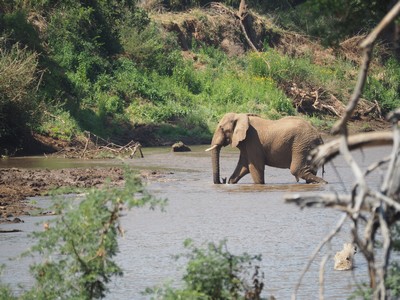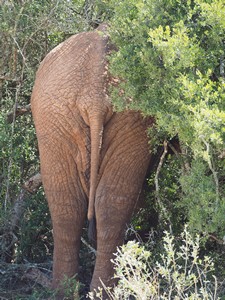 Voller Erwartungen auf Elefanten, zeigte sich der erste Dickhäuter dem wir begegneten, leider nur von hinten, da er Kopf voran im dichten Gebüsch steckte.