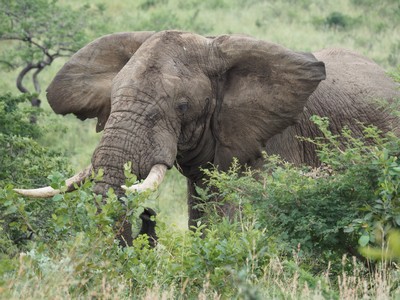 Direkt an der Piste entdeckten wir diesen Elefanten beim Fressen. Leider wurde der Kopf von den Büschen verdeckt.