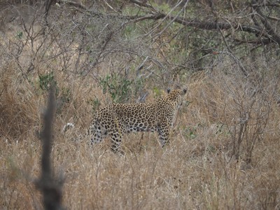 Nicht weit entfernt von der Löwin zeigte sich dieser Leopard, aber leider entfernte er sich gerade in die dichte Buschlandschaft hinein.