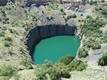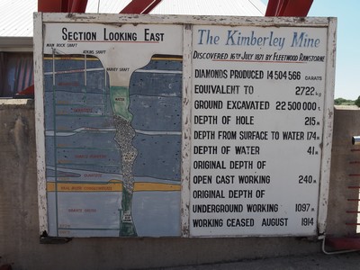 Durch eine 90 m lange Aussichtsplattform hat man einen atemberaubenden Blick auf das Schürfwunder. Es ist ca. 1 Km tief und hat an der Oberfläche ca. 1,5 Km Durchmesser und ist heute mit Wasser gefüllt. Allein zwischen 1871 und 1892 wurden 22,5 Millionen Tonnen Erde bewegt. In unzähligen Claims arbeiteten 30'000 Schürfer rund um die Uhr, bohrten sich immer tiefer durch den blaugründigen Kimberlite. In Eimern und Karren wurde das Gestein hoch befördert. Dicke Seile hingen bis zum Grund und wurden jeden Tag ein Stückchen länger. Der Tagbau ging bis ca. 240 m in die Tiefe, danach wurde über den Minenschacht weiter geschürft.