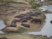 Die Hippos lassen sich vom Elefant beim baden nicht stören.