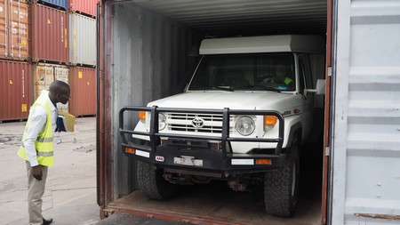 Der Toyota ist nun bereit für die Befestigung und Sicherung im Container.