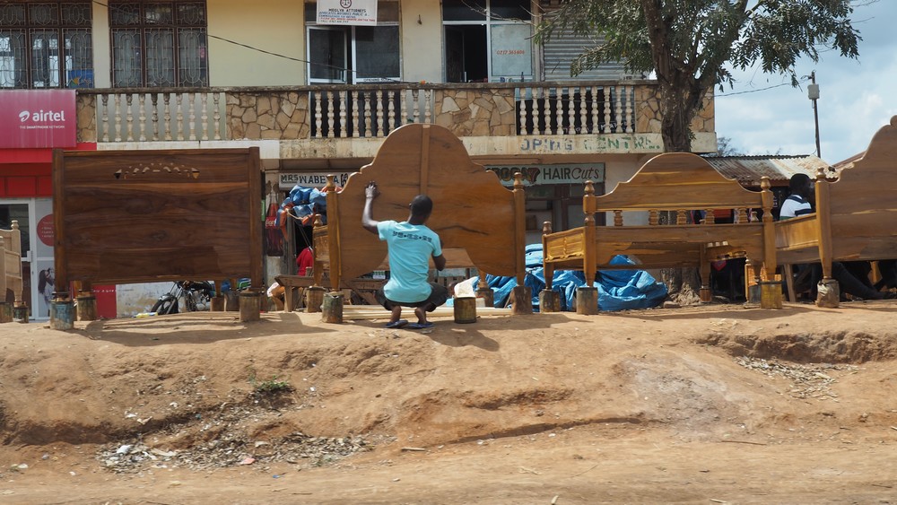 Der Schreiner bietet hier seine Ware, die Betten, in einer Freiluftausstellung an.