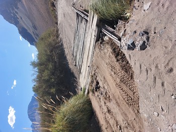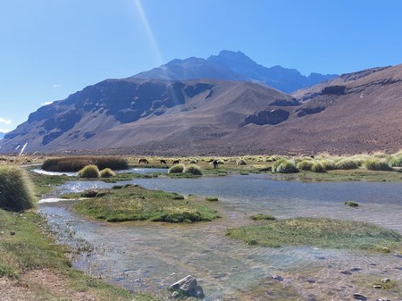 Umringt von den Anden führt eine ca. 60 Km lange Schotterpiste in wunderschöner Landschaft zu den Termas El Sosneado. Die Piste führt dem Fluss Atuel entlang. Im Tal werden Pferde, Rinder und Schafe von Gauchos gehalten.