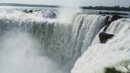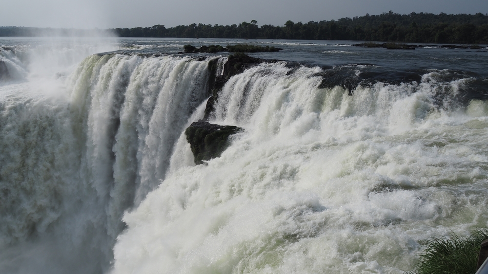 Über die Sturzkante ergiesst sich im Mittel 1700 m3 pro Sekunde. An einem halbmondförmigen 2,7 Km breiten Basaltriegel, wird der Fluss hier in den Abgrund geschickt.