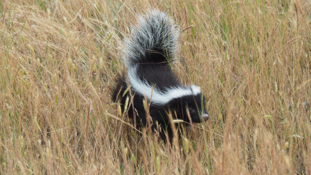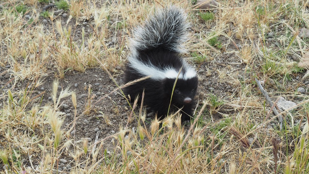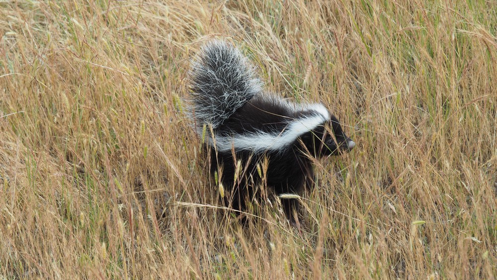 Auf unserem wilden Übernachtungsplatz tauchte plötzlich ein kleines Stinktier auf. Vorsichtig, jedoch mit etwas Abstand fotografierten wir das niedliche Tierchen. Wenn es Gefahr wittert, spritzt es ein sehr stinkendes Sekret ab. Wenn es die Kleidung trifft kann man sie mit Sicherheit wegwerfen, denn der Geruch geht nie wieder raus, auch nicht bei mehrmaligem waschen. Ebenfalls auf der Haut hält sich der üble Geruch über Tage.