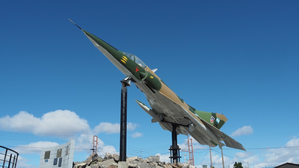 Im Hafen von San Julian ist bei einer Gedenkstätte ist diese Mirage ausgestellt.